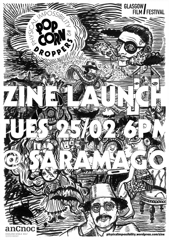 I’m also very excited to be launching issue two of my Physical Impossibility cult movie zine during the festival. The launch is going to be at Saramago @ CCA on Tuesday 25/02, 18:00-20:00. Up-to-date details can be found at the Facebook event page here. Physical Impossibility is also a featured zine at the Central Station website – read their preview here. The launch is the same evening as two other GFF events at CCA – the free but first-come-first-served Film/TV Locations: Scotland on Your Screen at 18:30 and the Andy Diggle and Jock in Conversation event at 20:00 – so if you’re in the area, feel free to drop in for a wee whisky and maybe pick up a zine!