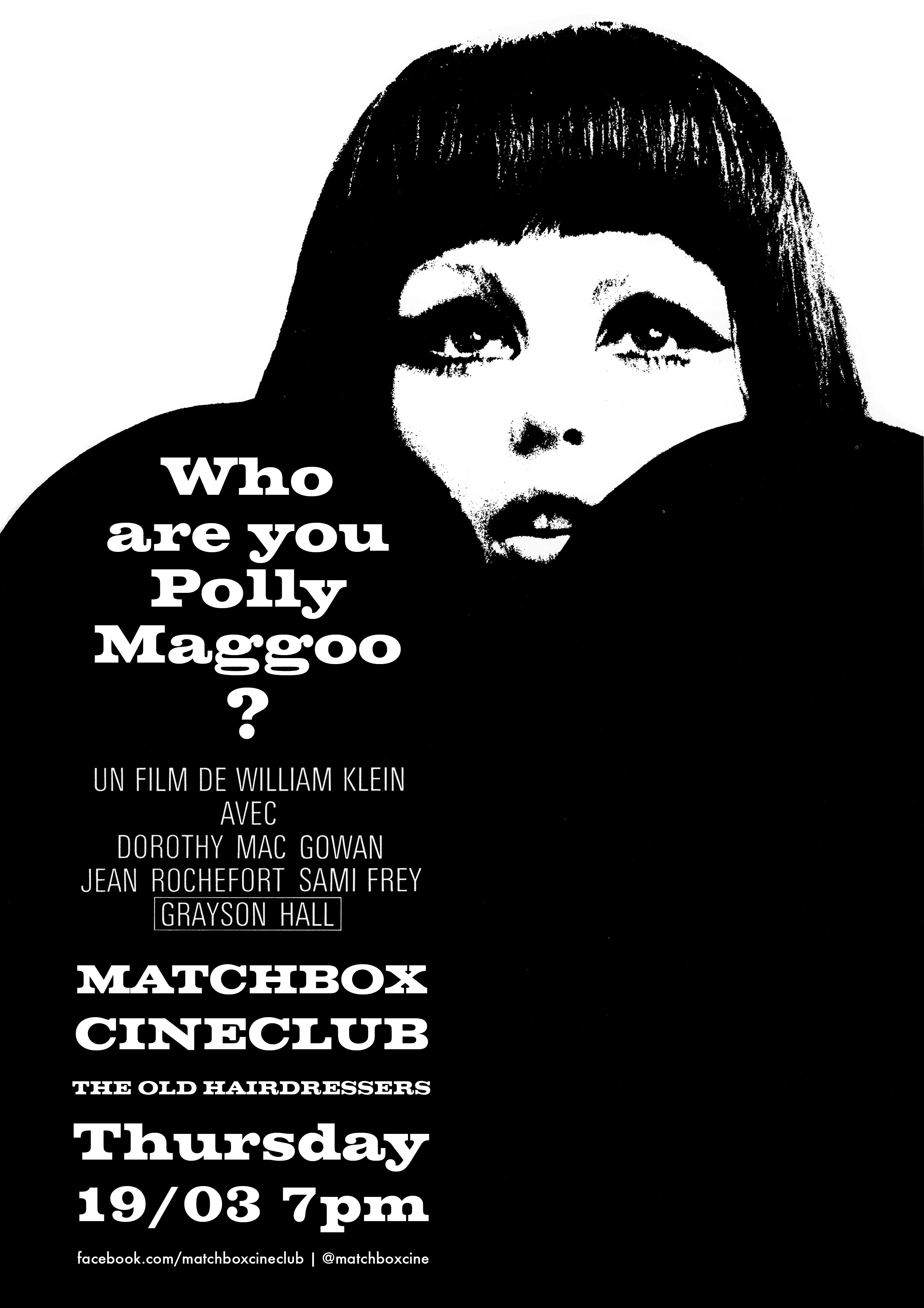 Our March screening at The Old Hairdressers will be William Klein’s Who Are You, Polly Maggoo? (Qui êtes vous, Polly Maggoo?, 1966). The screening takes place at 7pm on Thursday 19/03, upstairs in the gallery area of the bar. Klein’s rarely-seen film has been described as “a fashion exposé, a raucous attack on media, and a fractured fairy tale,” and is one of Matchbox’s very favourites. Read more about it here, here and here. Our screening is by kind arrangement with Arte.