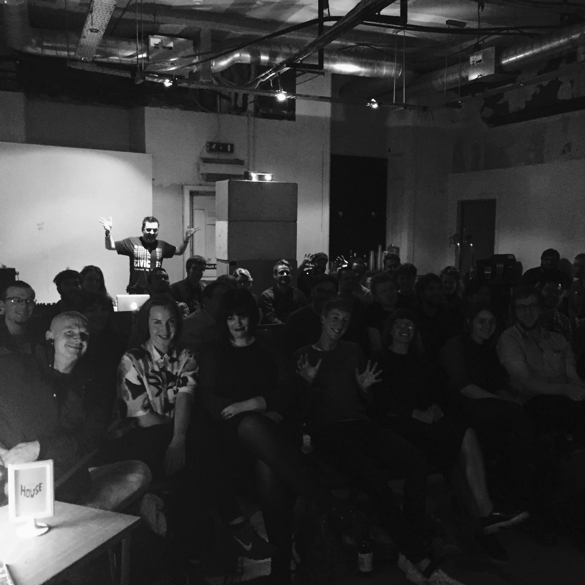 Yay, mission accomplished. Look at all these happy faces. Full disclosure, I bribed these guys with a chance to win a DVD copy of House. Note our wonderful DJ for the evening, Chad Palestine at the back and see the top of this post for our version of an audience survey.